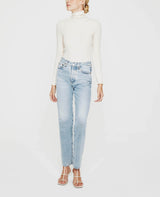 The Chels Turtleneck for women features a creamy white hue, classic fold-over neck, extended sleeves, and a form-fitting silhouette. This women’s top is designed in 2 x 1 Lyocell Rib fabrication, offering comfort and luxury in a wider rib construction. Our in-house looms deliver the precision knitting needed to accomplish the characteristic 2x1 weave that lends to the fabric’s superior comfort and draping qualities.