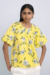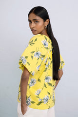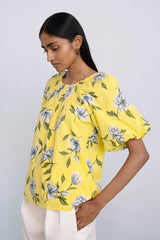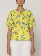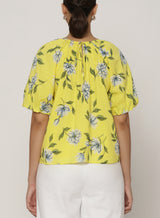 This season's Killara print features blooming Australian florals on a sunny quince color. The Oana top's dramatically puffed sleeves and inverted front pleats are gathered into a drawstring back keyhole.