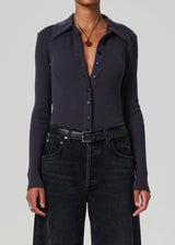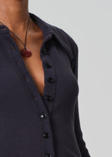 Looks Like: Dark grey long sleeve fitted button up shirt with collar