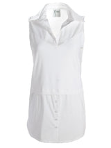 - This white collared shirt for layering features an over the head style with an invisible side zip