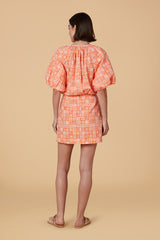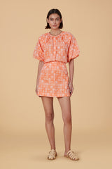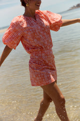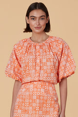 The Freda top features delicate button details and playful puff sleeves with an overall relaxed fit. The Freda in our Spring Checkerboard print is a coral and white tile-inspired design. Ornamental tile shapes with quatrefoils, florals, and starbursts – reminiscent of Spanish ceramics. Perfect for summer outings- style with simple flat sandals to complete its effortless vibe.