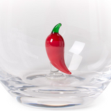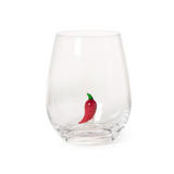 This hand blown stemless jumbo wine glass holds 20 ounces of your favorite drink. The red chili pepper that sits on the bottom of each glass will be unique and comes to life when the liquid magnifies its appearance.
