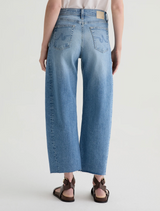 Our Hattie Crop in Helios is a high-rise barrel jean crafted from vintage comfort stretch denim. Finished in a light wash with raw hems, it blends a structured silhouette with a worn-in, laid-back feel.