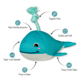 For pups that love to play in water! Meet "Splashy," a floating dog toy from our Splash Mates collection. Featuring a super loud squeaker, crazy crinkle paper, the ability to float, and high-visibility neoprene, this toy whale make sure your dog really sea-ses the day. Perfect to take to the beach, pool, and lake!